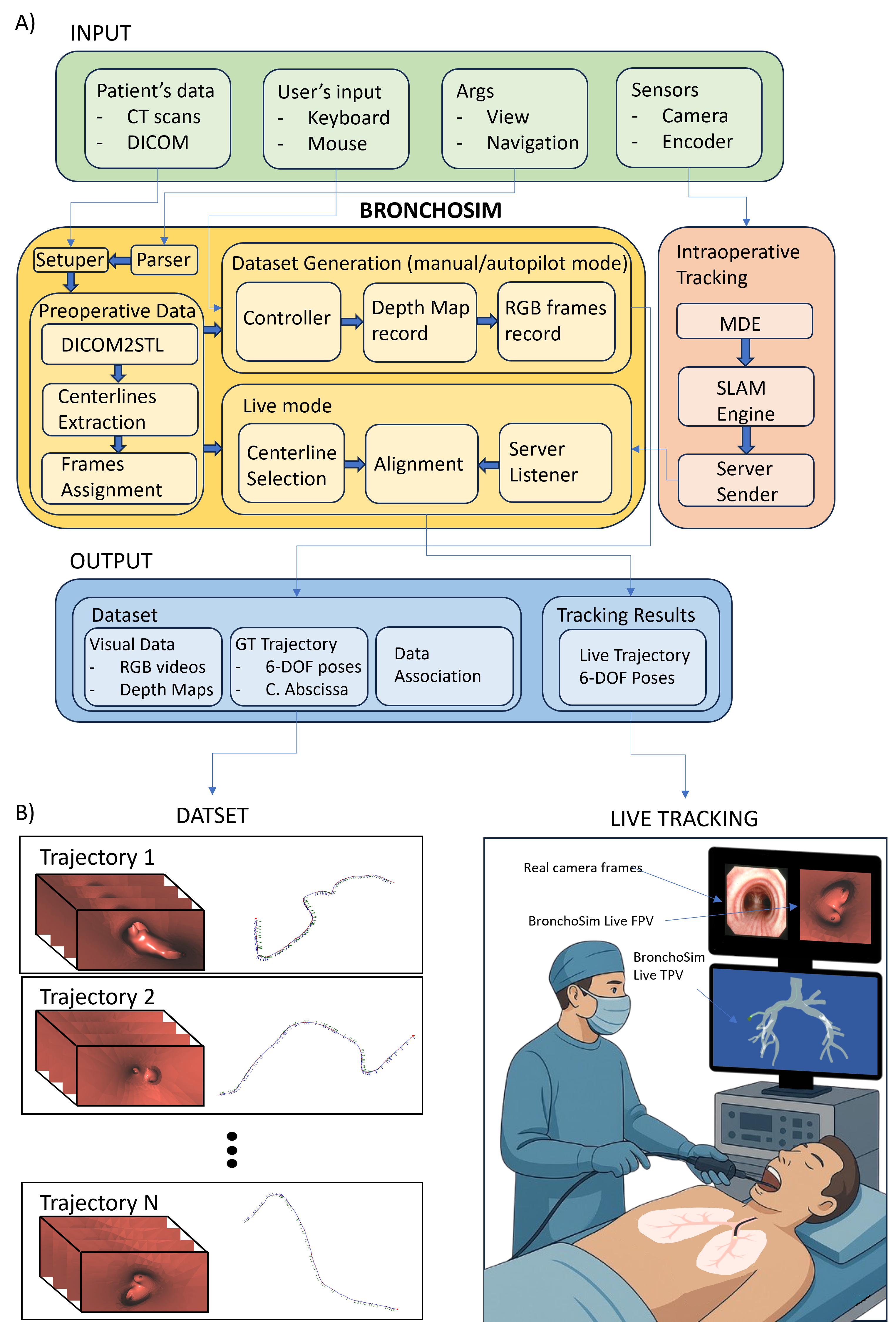 A) System Architecture: the input layer is composed of the patient’s anatomical data, user inputs, software args and sensors; these are fed to the main, which based on the modality selected by the user, starts the respective pipeline for dataset generation or live tracking; the output layer can include the generated synthetic dataset or the live trajectory of the bronchoscope during the procedure
