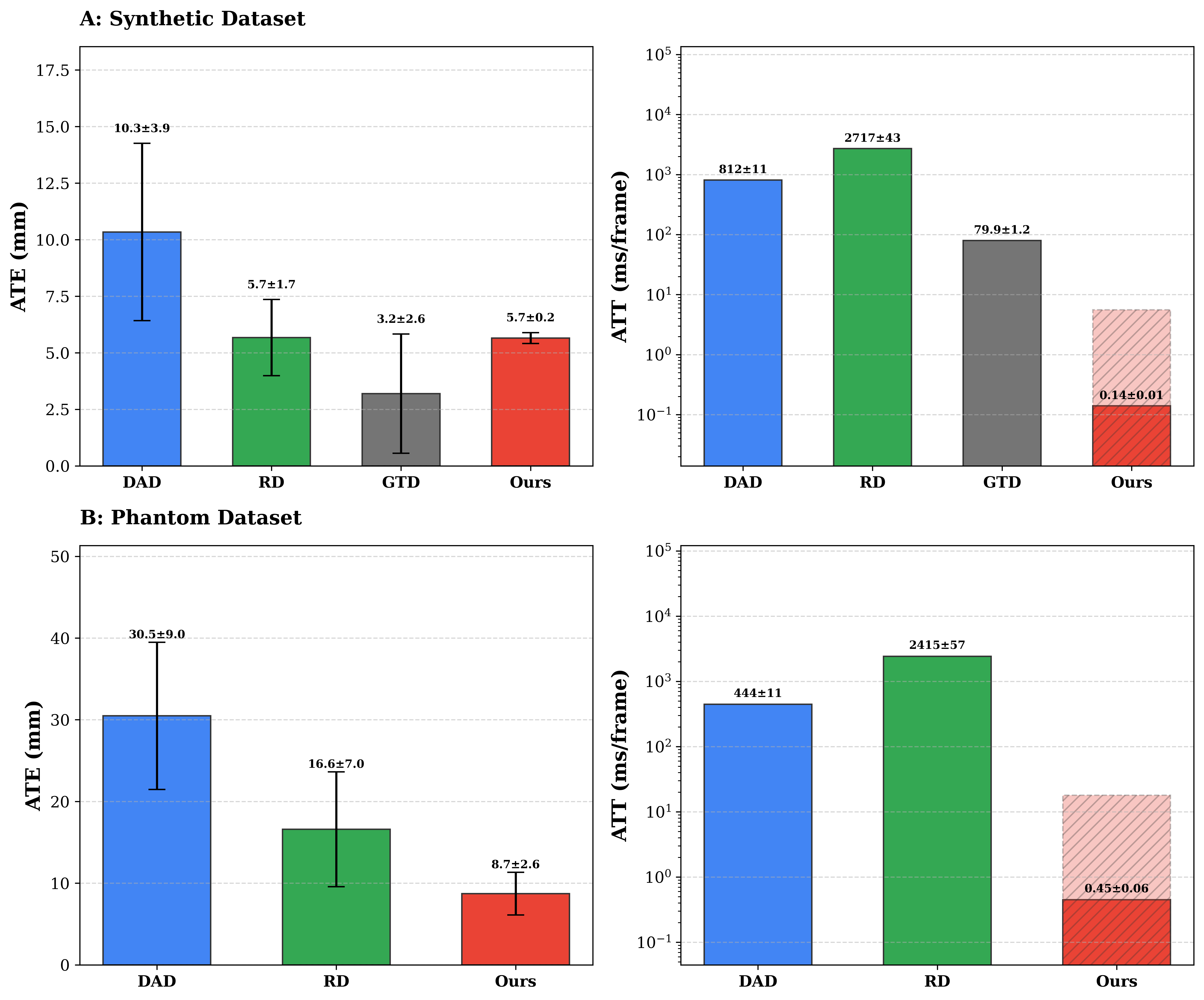 Quantitative comparison on synthetic (A) and phantom (B) datasets. ATE in mm (left) and tracking time in ms/frame (right, log scale).